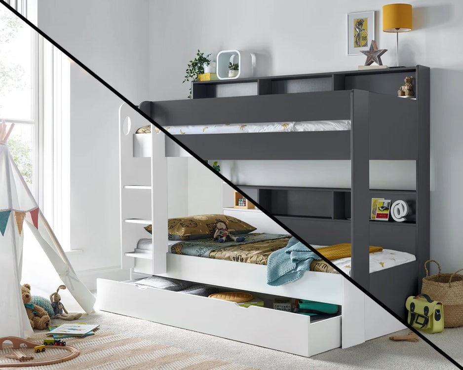 The Bedmaster Oliver Bunk Bed would bring style and storage to any kids bedroom. It features storage shelving and a drawer to declutter the kids bedroom. Available in a range of colours like white, grey, and onyx grey for modern themes in the bedroom.
