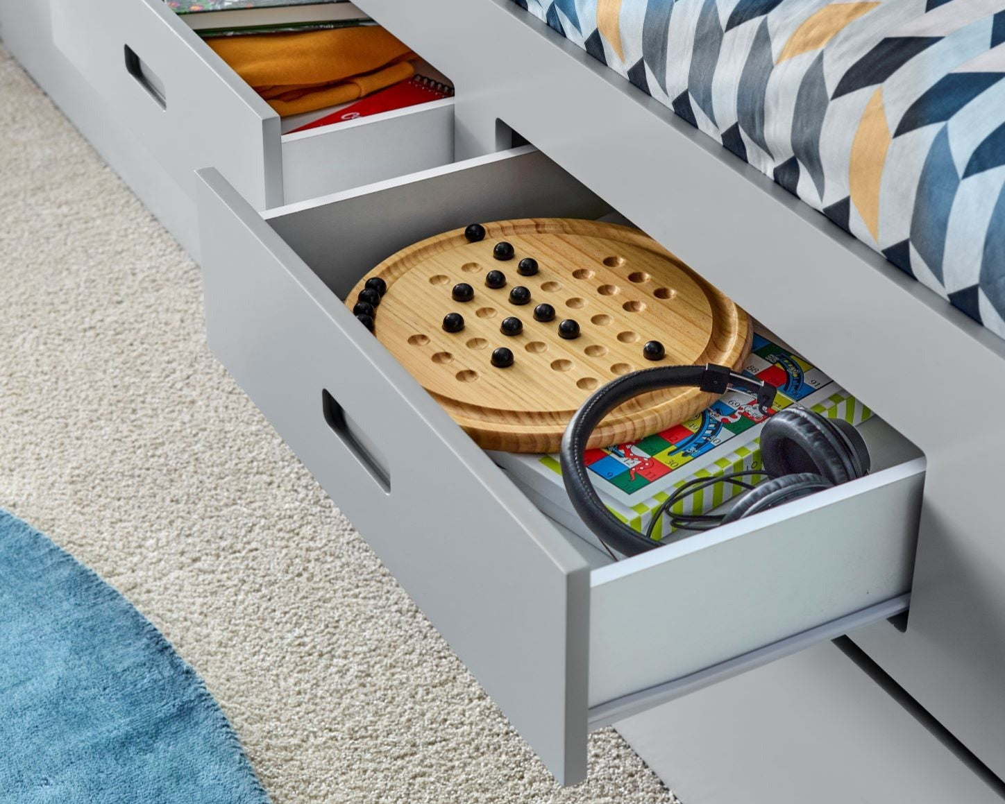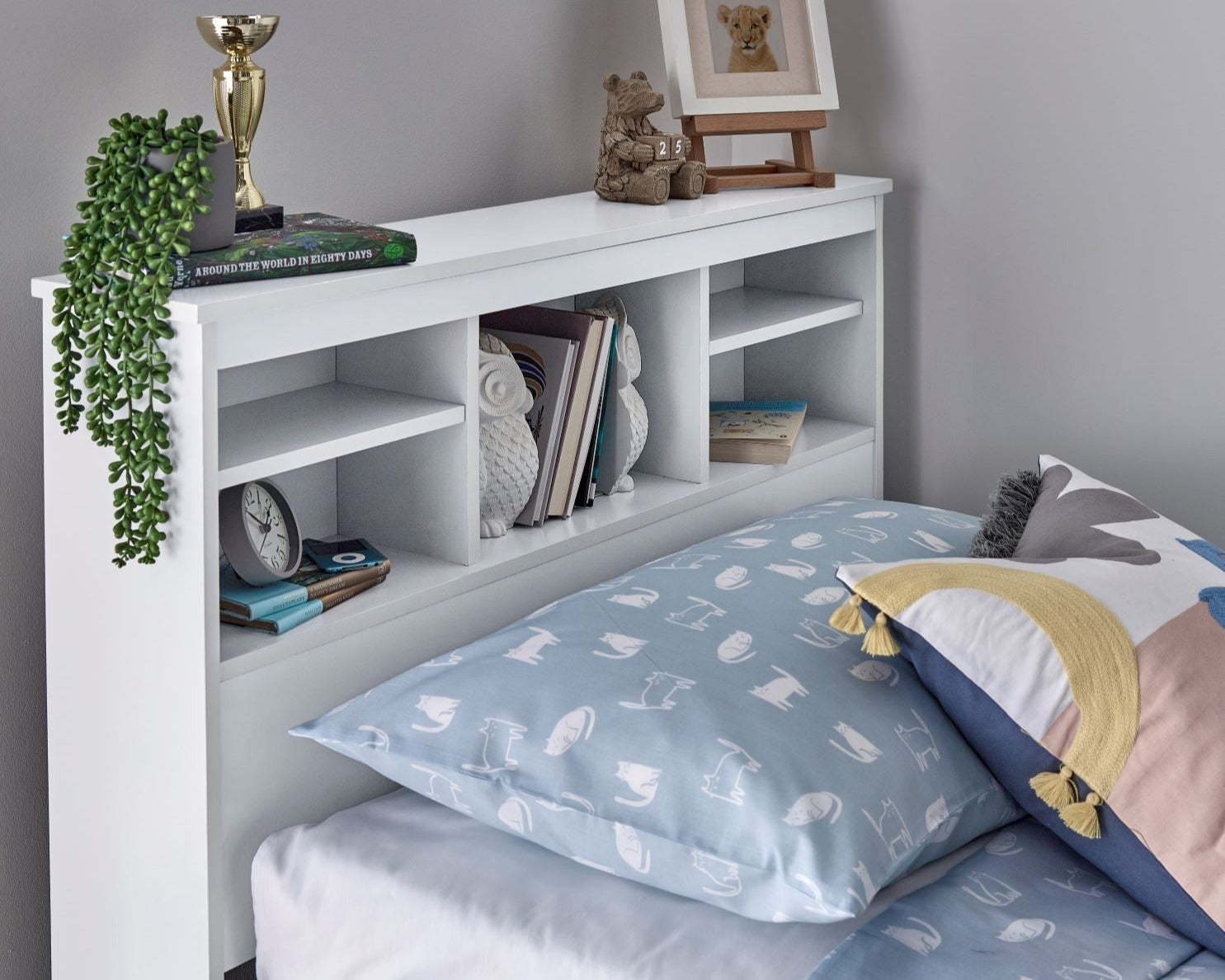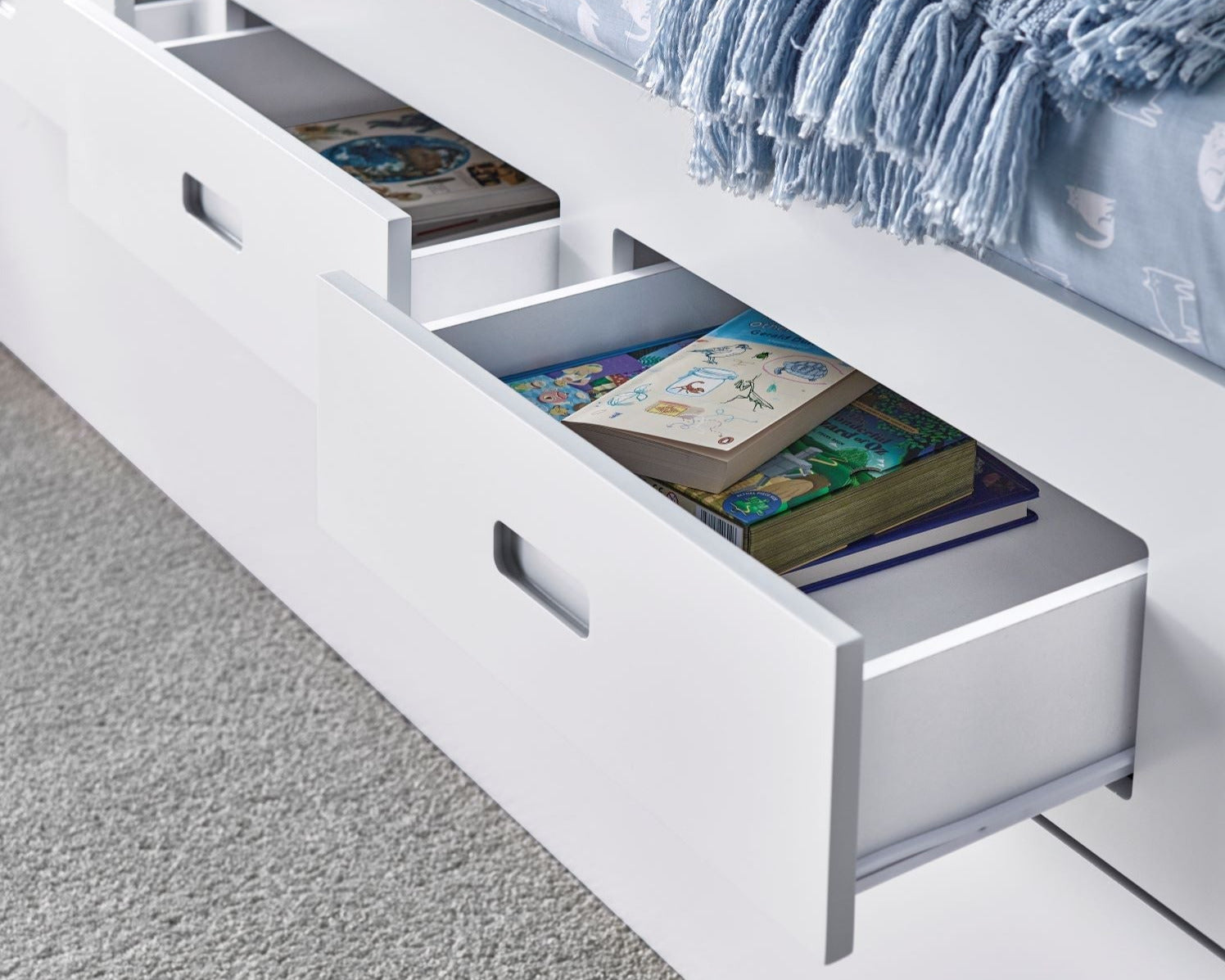 Maximise space with the underbed storage drawers and bookcase headboard. This kids storage bed is perfect for decluttering the bedroom and offering easy access to accessories. The under bed trundle can be used for a mattress but also to provide quality storage space for spare pillows, duvets, and clothing products.