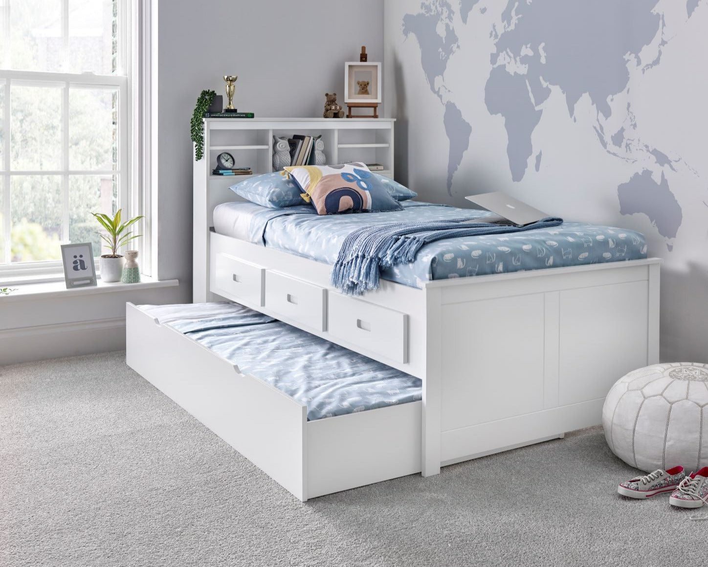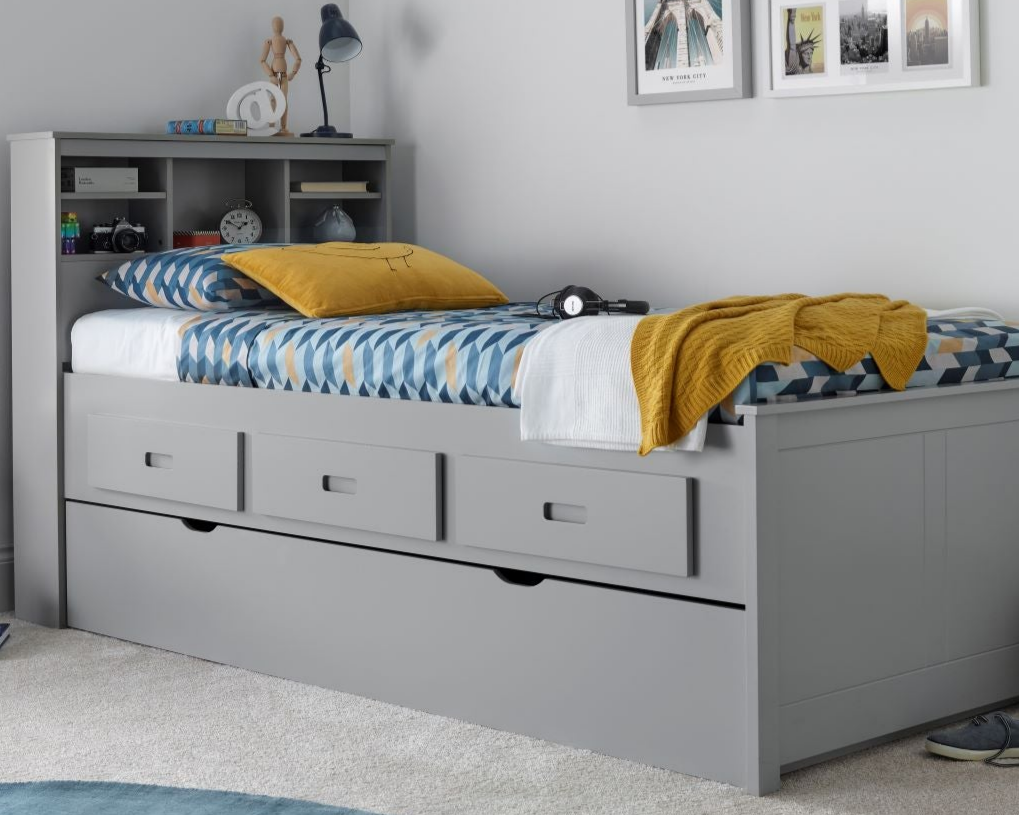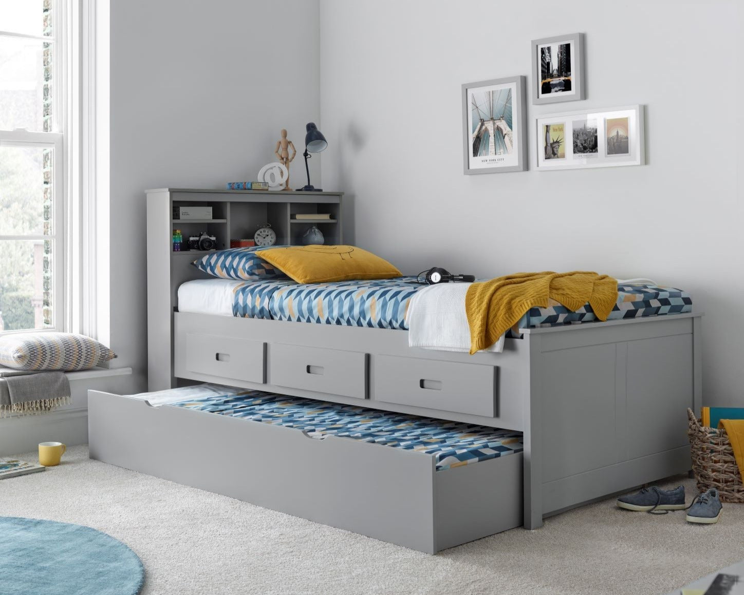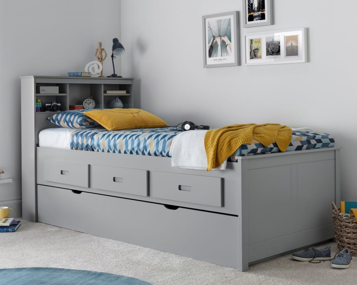 Transform the kids bedroom with the Bedmaster veera guest bed. It features a trundle and bookcase design to bring de-cluttering advantages to the children's bedroom. Available in either white or grey, these colours are perfect for the kids bedroom. Add some new low-profile mattresses to this for the best solution, offering quality comfort for the boys and girls.