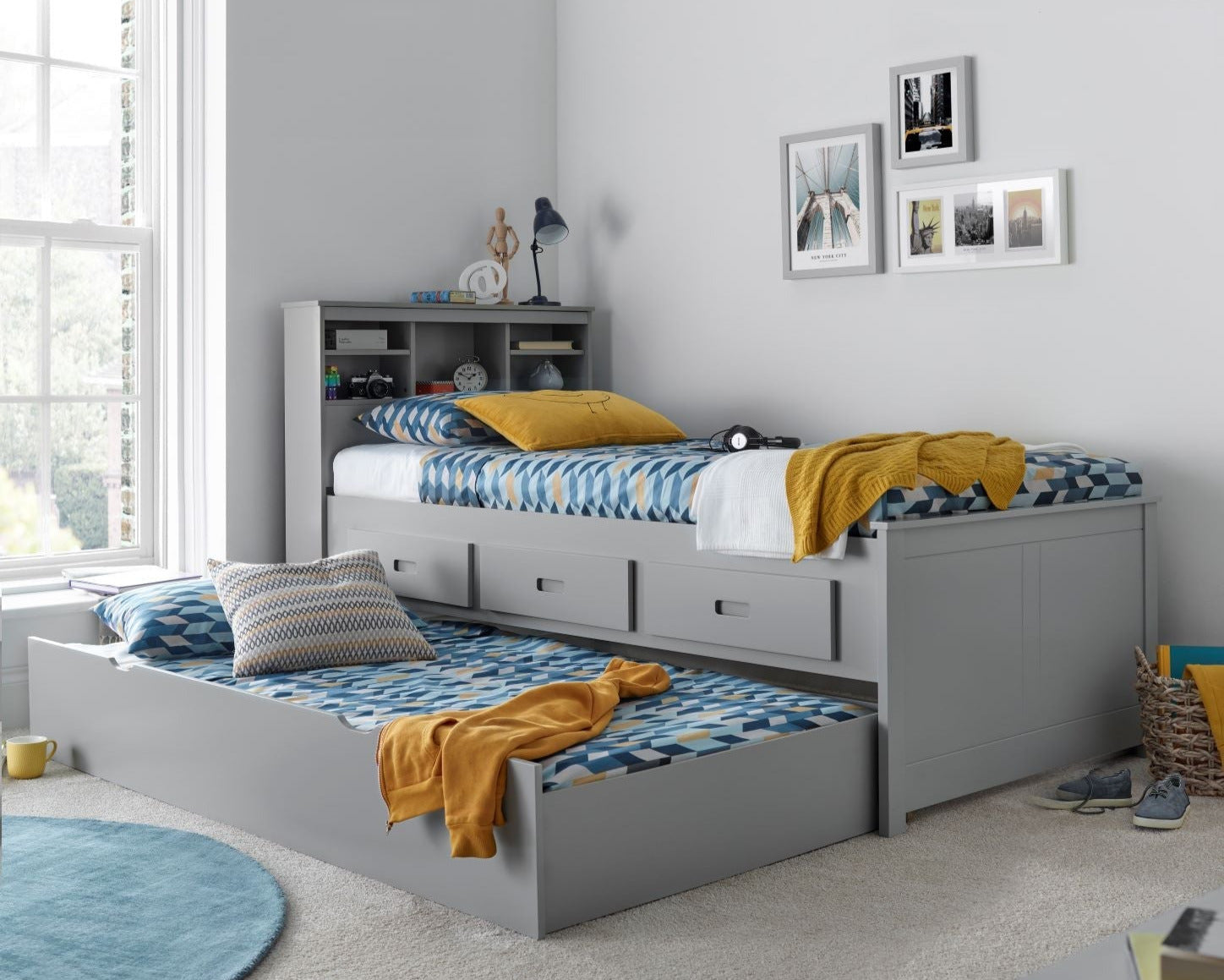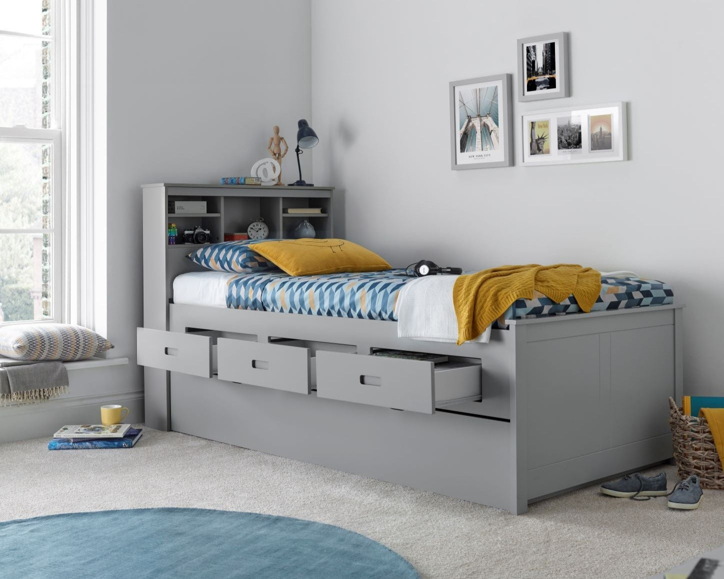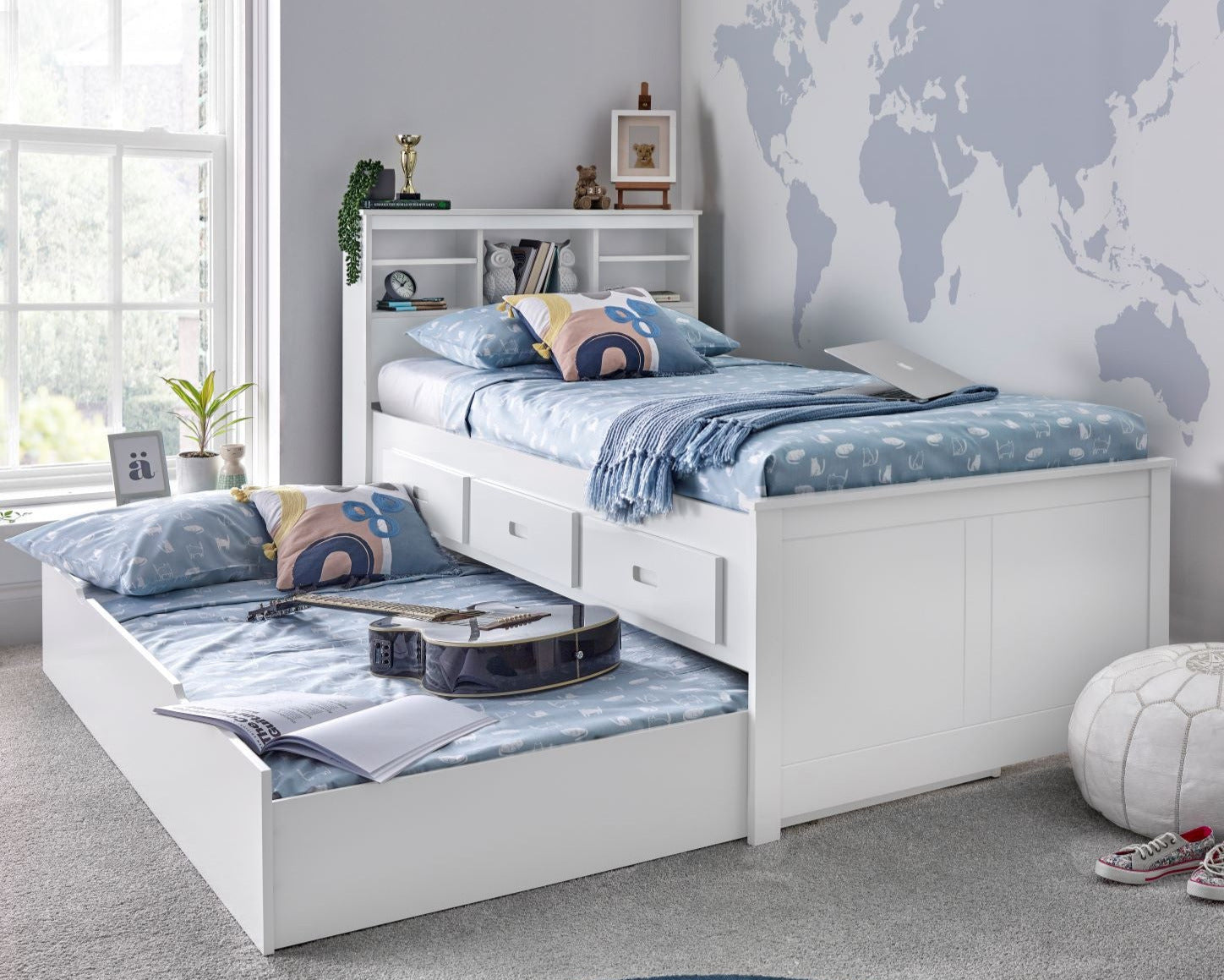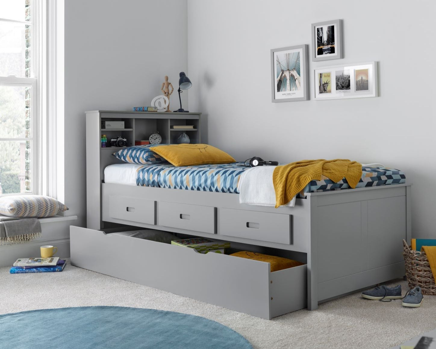 Transform the kids bedroom with the Bedmaster veera guest bed. It features a trundle and bookcase design to bring de-cluttering advantages to the children's bedroom. Available in either white or grey, these colours are perfect for the kids bedroom. Add some new low-profile mattresses to this for the best solution, offering quality comfort for the boys and girls.