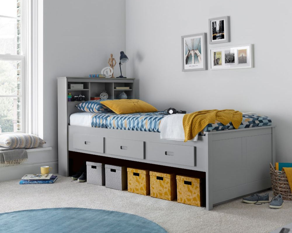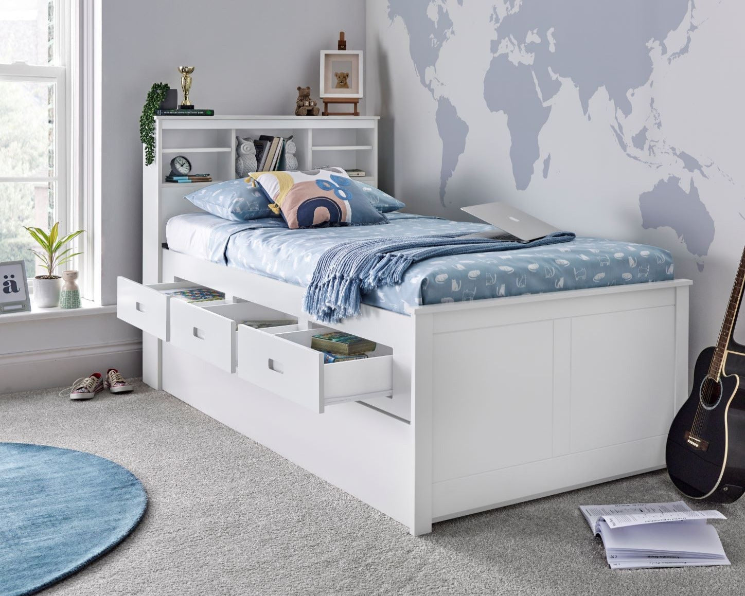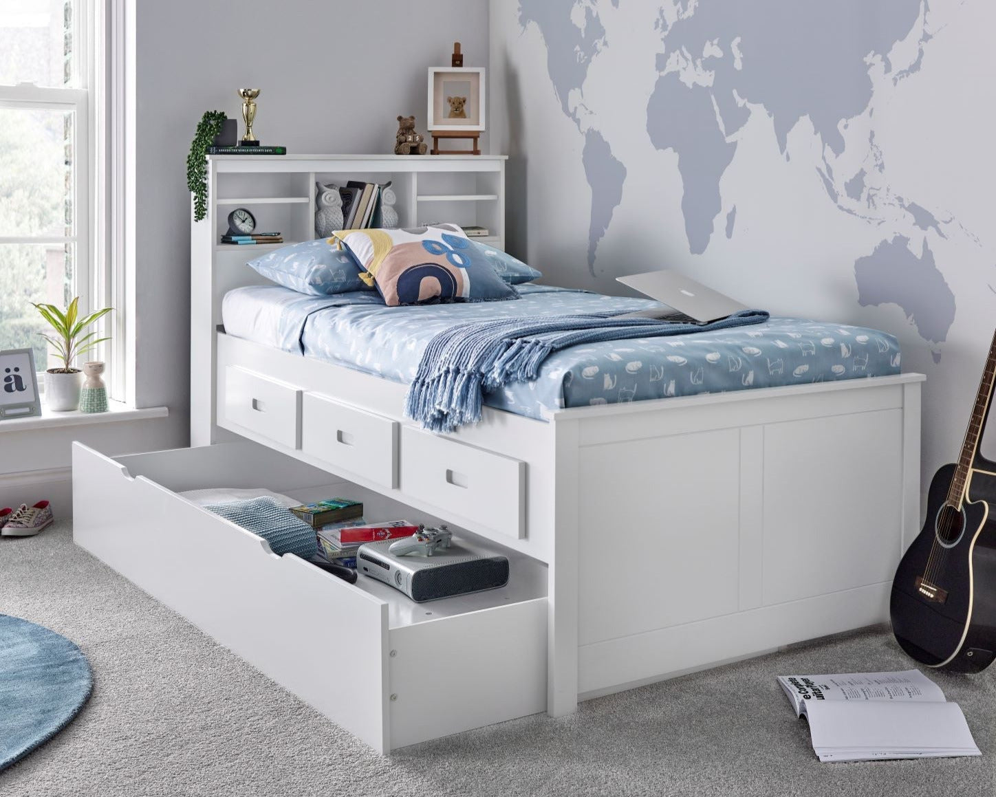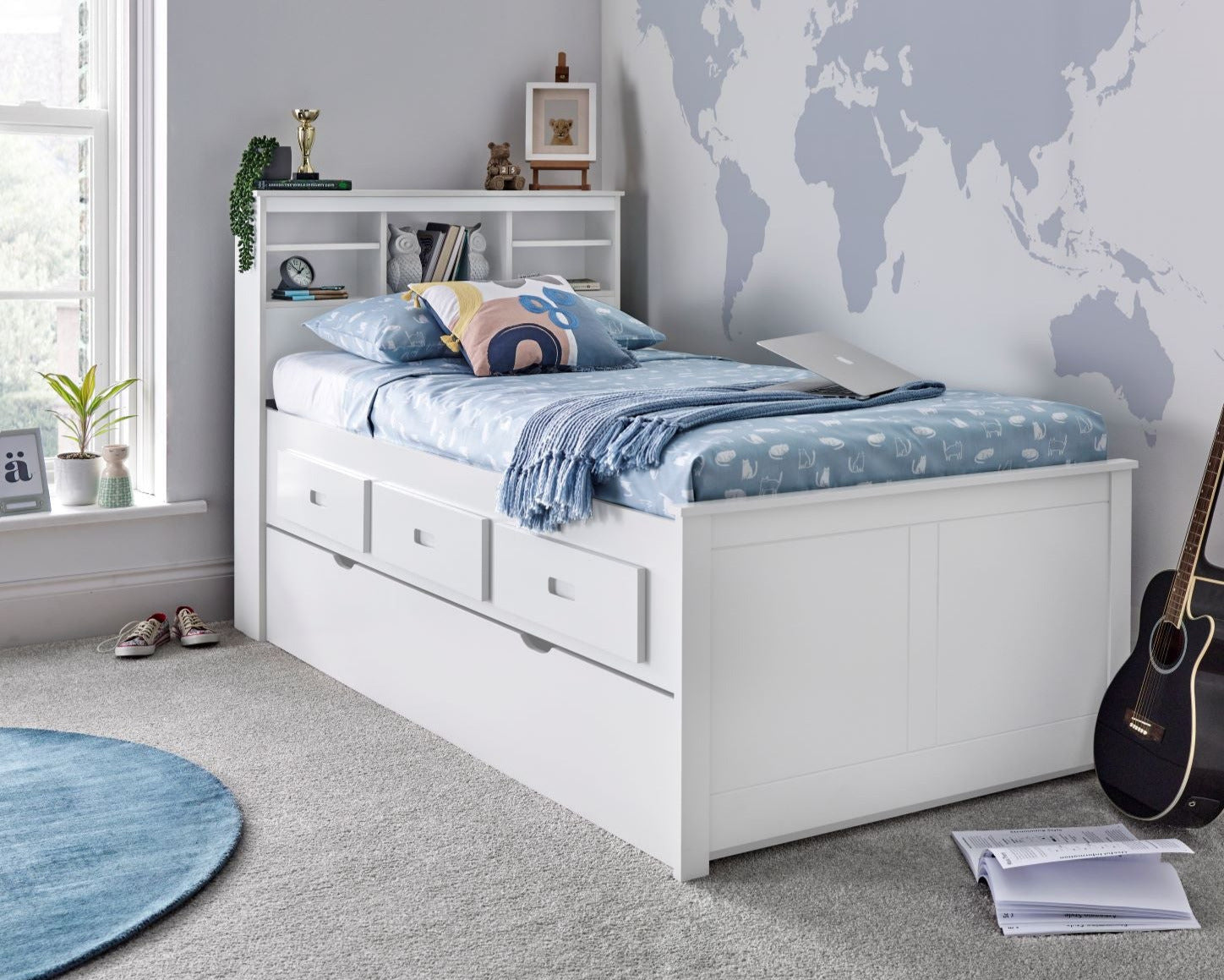 Transform the kids bedroom with the Bedmaster veera guest bed. It features a trundle and bookcase design to bring de-cluttering advantages to the children's bedroom. Available in either white or grey, these colours are perfect for the kids bedroom. Add some new low-profile mattresses to this for the best solution, offering quality comfort for the boys and girls.