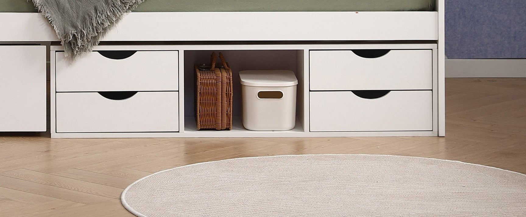 This kids storage daybed features drawers and shelving to declutter the children’s bedroom. The drawers and shelves are the perfect solution for small accessories to be placed to organise the bedroom. They are all separated, which is great for keeping the kids bedroom tidy and neat.
