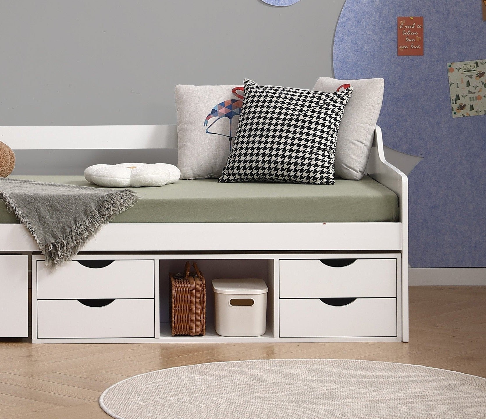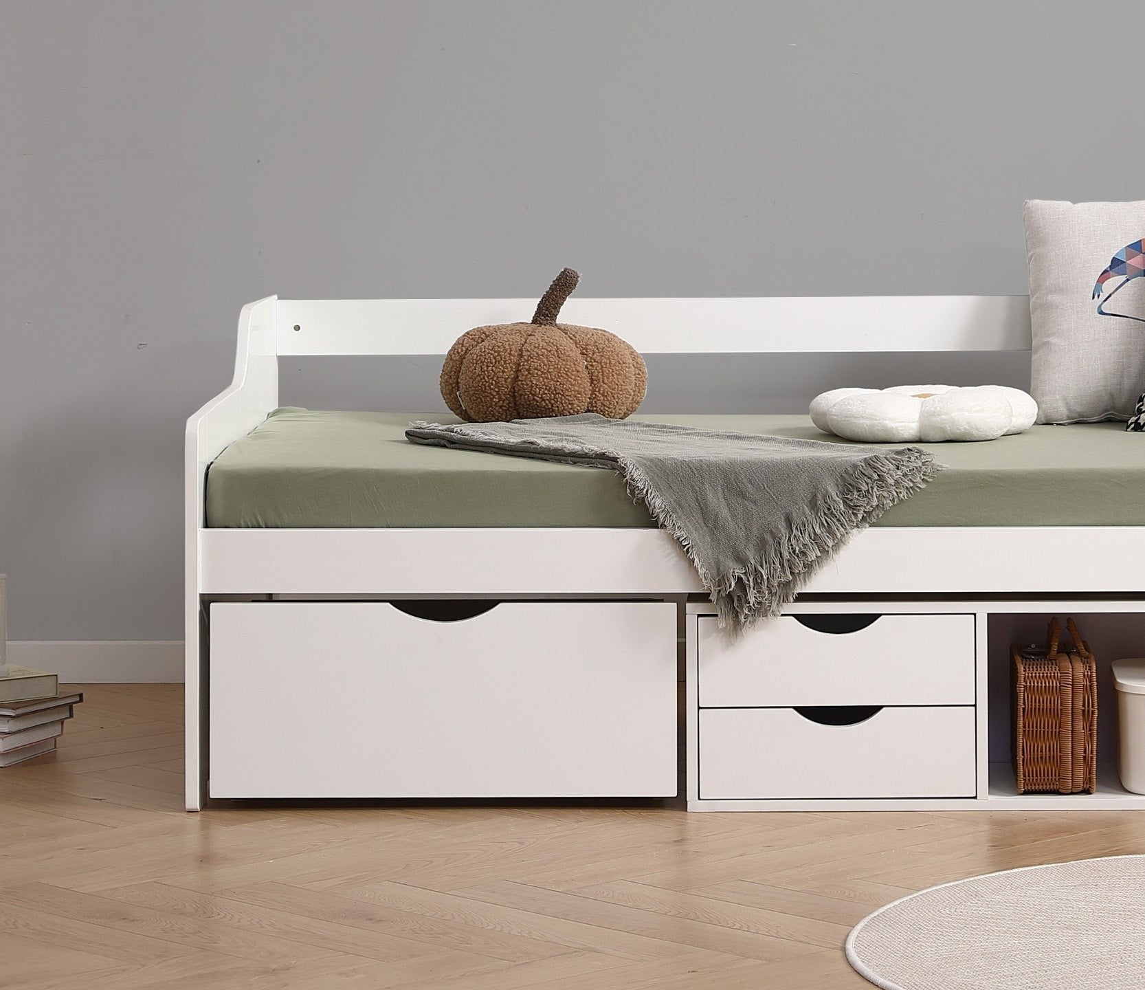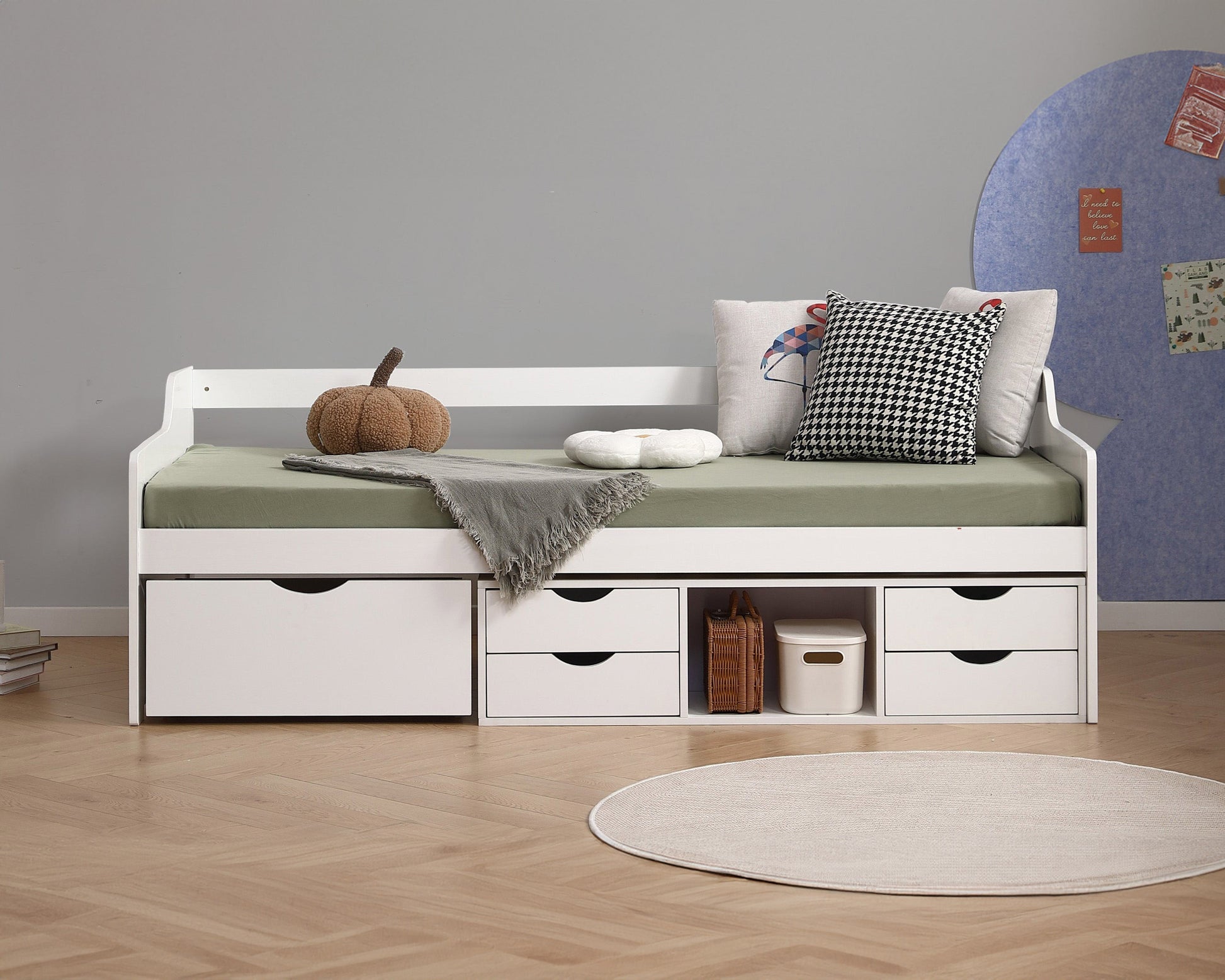 Make the kids bedroom transform into a magical haven with the Gabriel Daybed. This kids daybed features drawers and shelving, making this a great choice for a nursery or bedroom. With a neutral white children's daybed like this, the room will be impacted naturally.