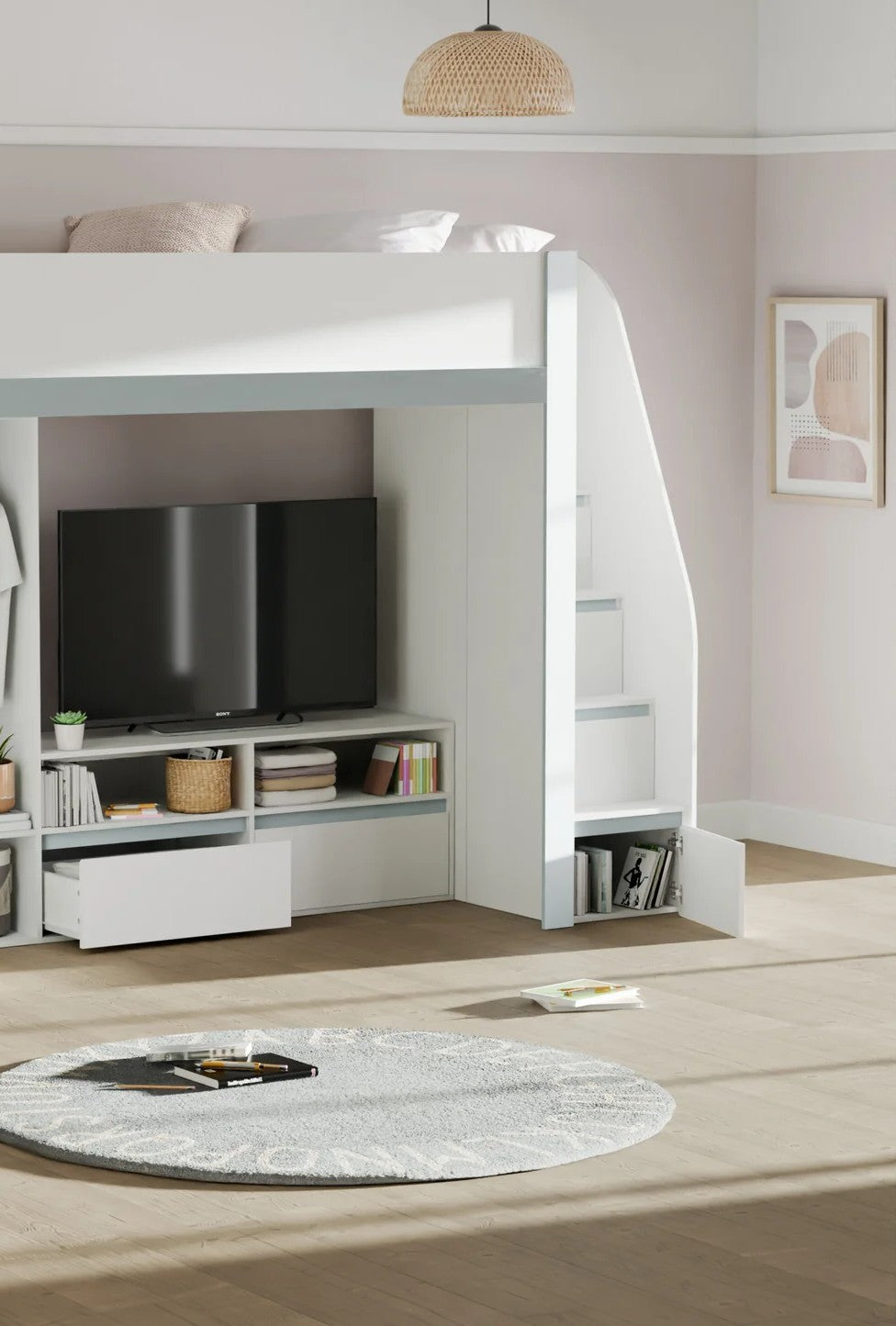 This kids storage bed has everything your child will need in 1 place. The storage drawers could be used for small bedtime accessories and gaming material. The storage compartments on the stairs are going to be useful for books and toys. With the wardrobe, your kids clothing can be hung naturally, right there, ready for when they wake up. The shelving could be used for easily accessible items and show off colours and textures in the bedroom for a more welcoming setting.