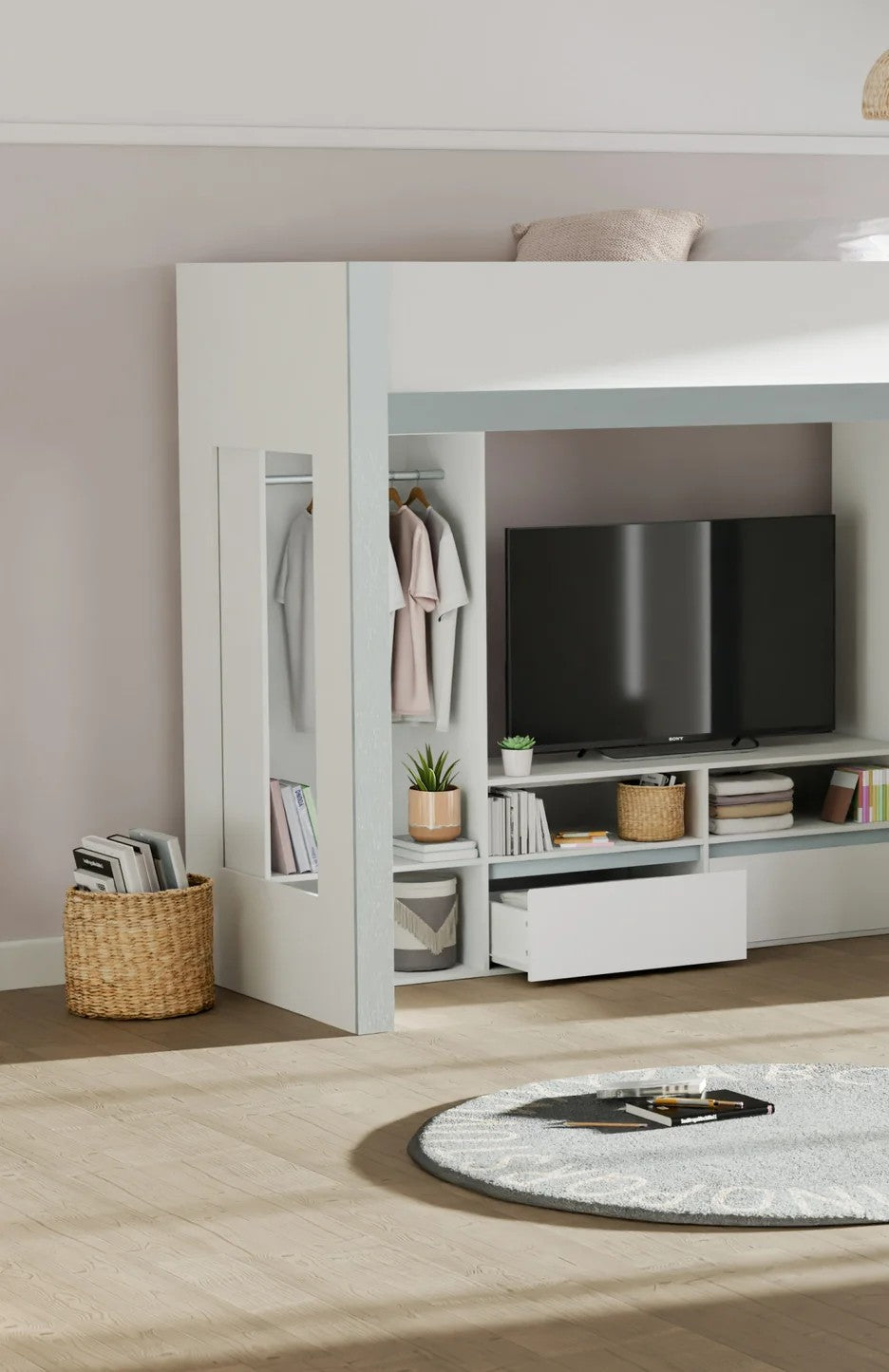 This bed can be used with a TV with this design, ideal for entertainment. The safe design features a sturdy staircase and guard rail to keep the kids safe while entering and using the top bunk section. The children's high sleeper bed is built using high quality materials for long lasting advantages.