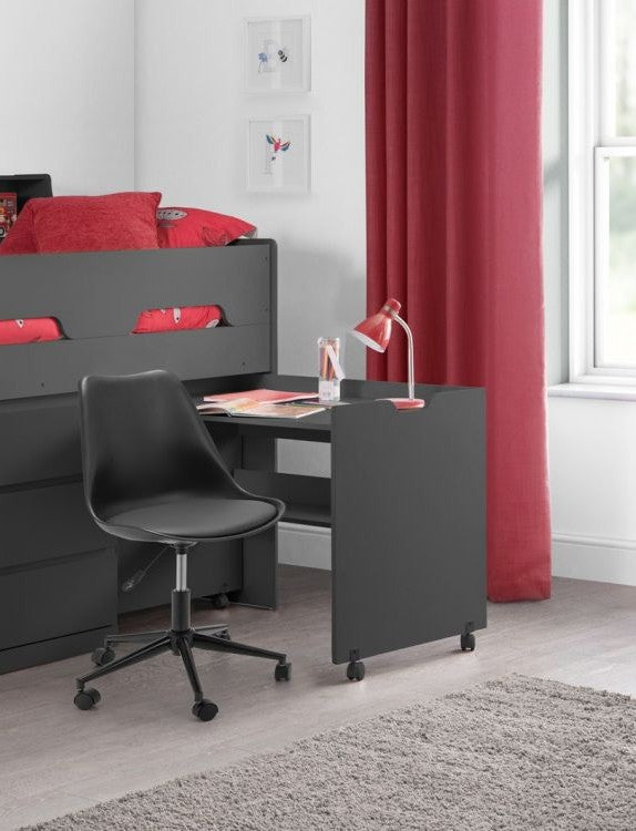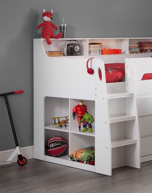 Designed for modern kids bedrooms, the Julian Bowen Jupiter Mid Sleeper Bed would supply storage and encourage learning in the room. This bed features drawers, shelving, and a desk so your kids have everything they need in 1 place. Avaible in a range of colours like oak, Anthracite, and white, this bed is going to offer style to the bedroom.