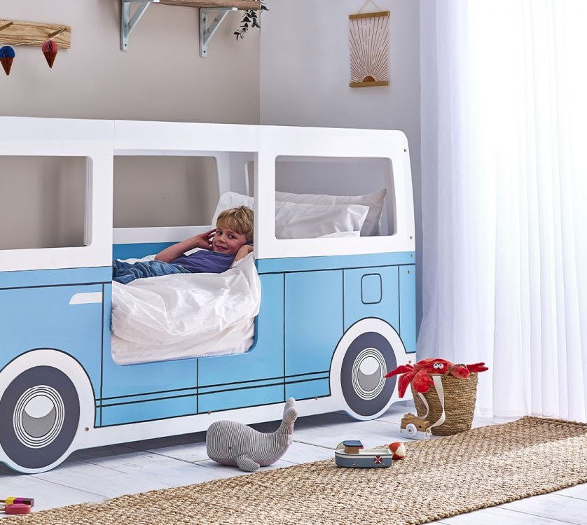 - Charming Campervan Design: Featuring playful camper-style details like wheel decals and round-arched windows, this bed doubles as imaginative décor—bringing a mini road-trip vibe into the bedroom.